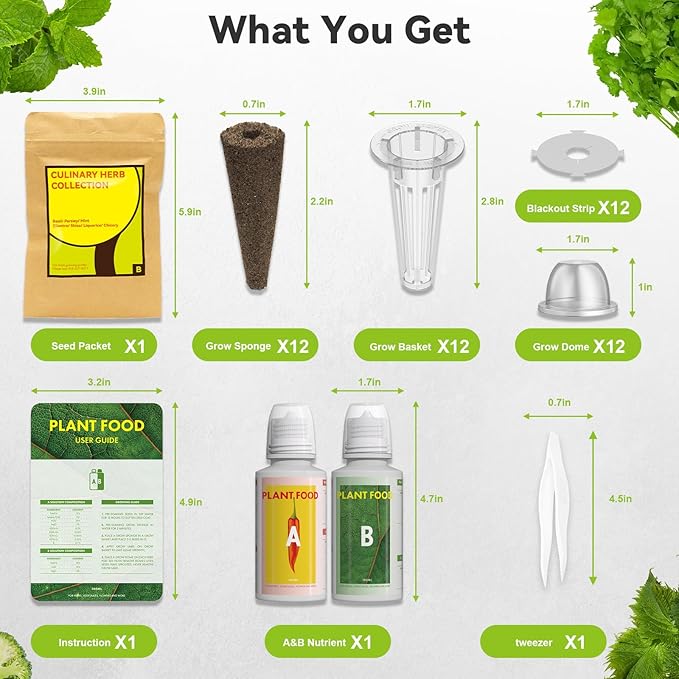 - Variety of Seeds: This herb seed pod kit includes seven types of heirloom seeds—basil, parsley, shiso, liquorice, mint, cilantro, and chicory—along with 12 grow sponges, 12 grow domes, 12 grow baskets, 12 foil stickers, and A&B plant food. Perfectly designed for the Inbloom 12-Pod HydroGarden. With over 350 seeds, you can grow your favorites and enjoy endless indoor gardening fun!
