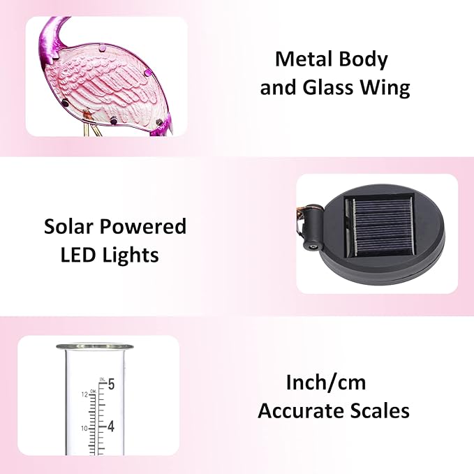 - 【Solar Powered】Flamingo rain gauge with a solar panel, charge by direct sunlight at daytime for 6-8 hours, 10 cool white LED auto shine 4-6 hours at night to be great ornament of your yard. Slide the button to the "ON" position and place it in the sun (a place without shadows).