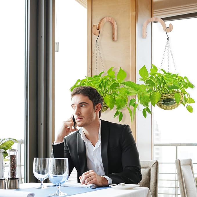 - Natural Raw Wood & Groove Design - Made of premium natural wood material, this plant hanger indoor is of very solid construction, and not easy to break or deform. Groove design helps keep hung plants in place, the plant hooks for wall are sold in pairs and look fabulous for indoor and outdoor use. Plant holders indoor hanging are able to withstand very windy and rainy weather, you could stain or paint them if desired.