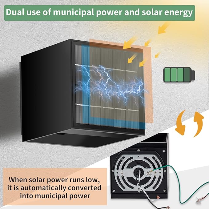 - 【Dual Power Source】Our Solar Wall Light offers the convenience of dual power options. It can be powered by solar energy during the day, harnessing the sun's rays to charge the built-in batteries. Alternatively, it can also be connected to a conventional electrical circuit for power supply. This ensures uninterrupted illumination, even when solar power is insufficient due to weather conditions or limited sunlight.