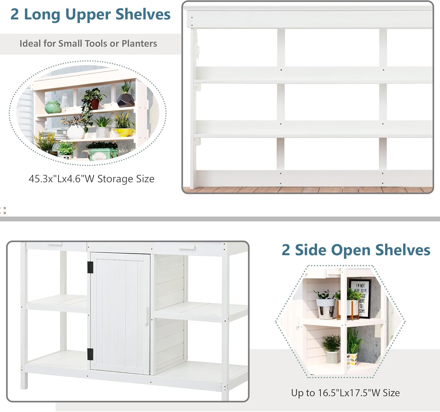 - Spacious Storage Shelves: A practical potting bench will be a back-saver when gardening. There are 4-tier open shelves in total for extra storage. Each upper shelf comes with a 45.3x4.6 inch length and depth so it will be enough to keep your small flower pots organized. Lower shelves on two sides will be ample enough for extra tools and other garden supplies.