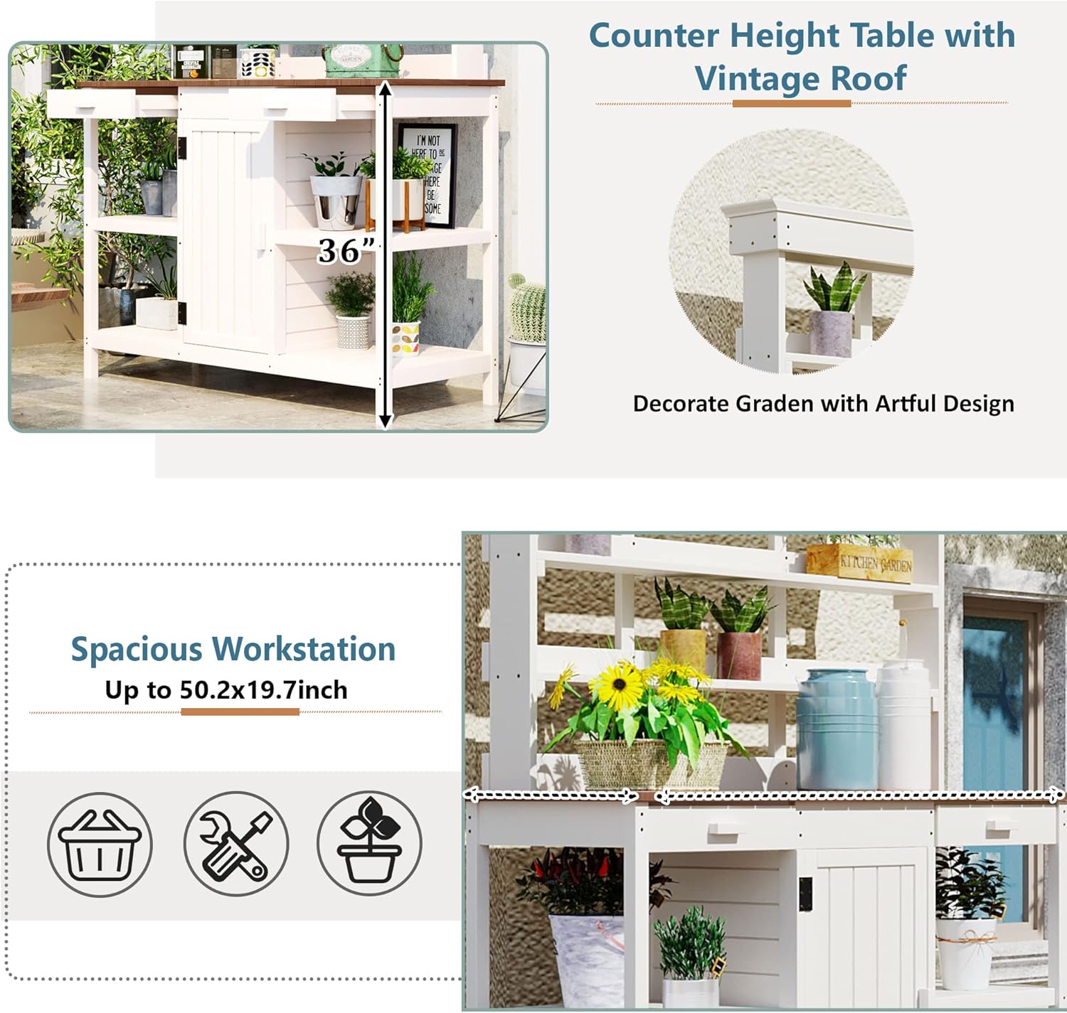 - Large Workspace: Once you have a potting table you will wonder why you get it now. Made of 100% fir wood, this potting bench is with larger workstation which is up to 50.2x19.7inch so it will provide lots of work room. All tools are in handy and it can also be an artful place to show your garden stuff.
