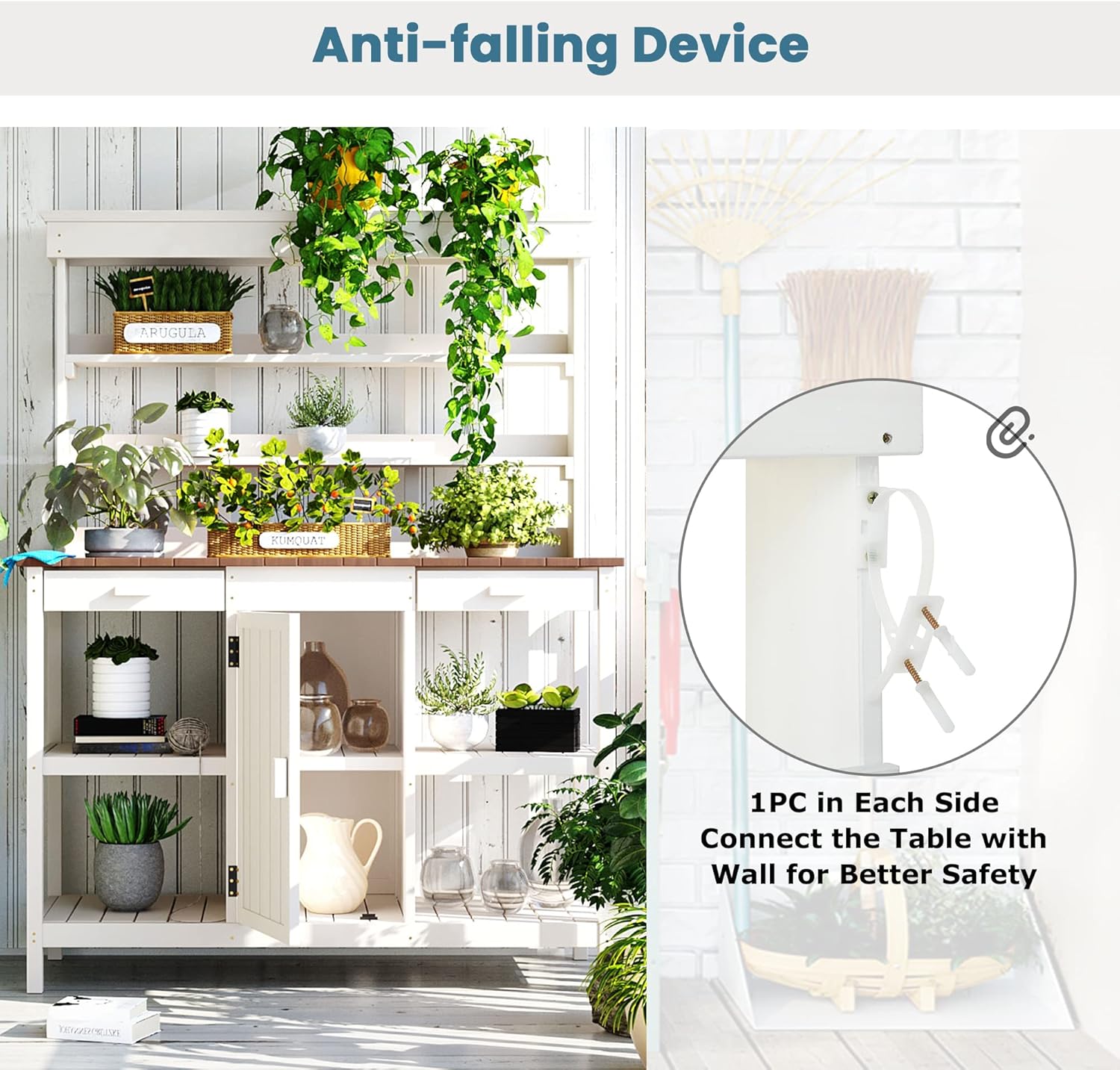 - Anti-Falling Safety Device: There is not always a flat in the garden. For your safety in setting the potting bench, it is designed with an anti-falling device. Just connect the device to the wall for better safety.