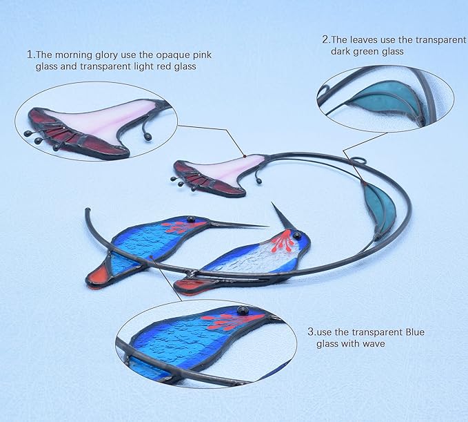 Lolitarcrafts Hummingbird with Flower Stained Glass Suncatcher Bird Stained Glass Window Hangings Hummingbird Gift for Home Decor (Blue 1 Pair)