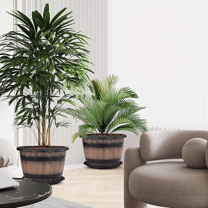 Quarut Large Plastic 4 Pack14 inch Plant Pots,Whiskey Barrel Planters with Drainage Holes & Saucer.Flower Pots Imitation Wine Barrel Design for Indoor & Outdoor Garden Balcony Plants.5 Gallons(Brown)