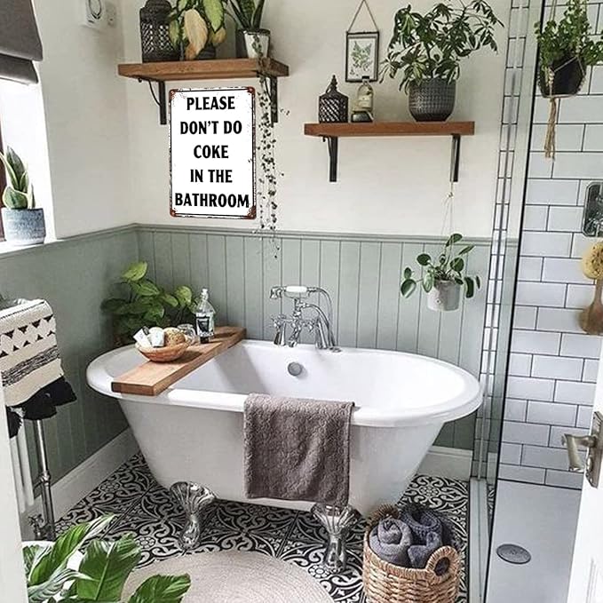 - WIDE RANGE OF APPLICATIOM: These funny metal tin signs are not really rusty.(Please Don'T Do Coke In The Bathroom Sign) It is a fun and attractive decoration for your House, Home, Room, Restroom๏ผToilet, Bathroom, college dorm or Garage.