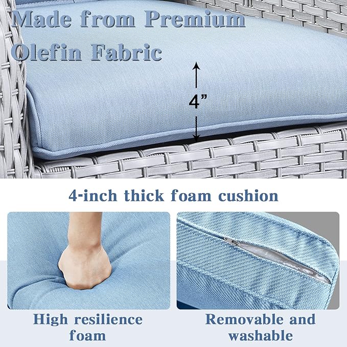 - 4.Comfortable And Easy To Clean: Both chairs in this outdoor patio set are equipped with 4-inch thick foam seat cushion and 8-inch thick cotton back cushion, which is ergonomic and improves the overall comfort of the wicker chair. The patio chair cushion covers are made of outdoor specialty olefin fabric that is water resistant, and each cushion is equipped with zippers that are removable and easy to clean.