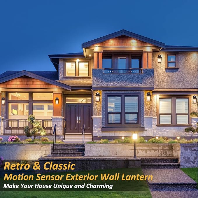- 【Stylish, Classic & Versatile】Boasting a timeless, classic design complemented by a textured matte oil rubbed bronze finish and distinctive glass, our motion sensor outdoor wall lights make an eye-catching addition to any outdoor area. Ideal for doorways, garages, porches, and yards, these motion sensor outdoor porch lights have both style and function.