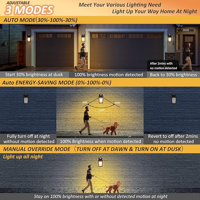 - 【Enhanced PIR Motion Activated & Dusk to Dawn Sensor】Our smart bronze outdoor lights feature 3 versatile lighting modes, providing ultimate convenience. Mode①: The motion sensor outdoor light maintains 30% brightness at night, increases to 100% when motion is detected, and returns to 30% after 120s. Mode②: The exterior light remains off until motion is detected at night, then illuminates at full brightness. Mode③: Manual override mode for continuous 100% brightness at night for 8+ hours.