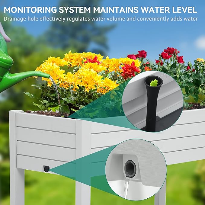 - Versatile Design: Our elevated garden bed adapts to fluctuating water levels with a float, ensuring optimal plant hydration; Side drainage holes efficiently remove excess water, while the central divider separates soil and water for moisture control