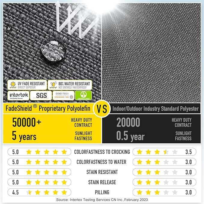 - 【FadeShield - UV Fade Resistant】FadeShield Proprietary Polyolefin are dependable indoor/outdoor performance fabrics, they are infused with antimiсrоbial silver Ion technology and can withstand 5 years of UV fade resistance, solution-dyed to make sure that each color is deeply ingrained in every fiber for continued vibrancy, even after heavy use. We recommend bringing it indoors when it rains or when not in use to preserve its lifespan and keep it looking beautiful.