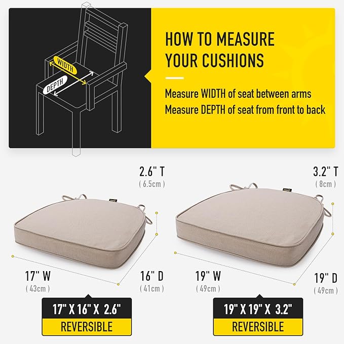 SUNROX Gel Memory Foam Chair Cushions, FadeShield Water-, Stain-Resistant Durable Reversible Seat Cushion Pads with Ties for Indoor/Outdoor Kitchen Dining Office, 19"x19", Set of 2, Husk Birch