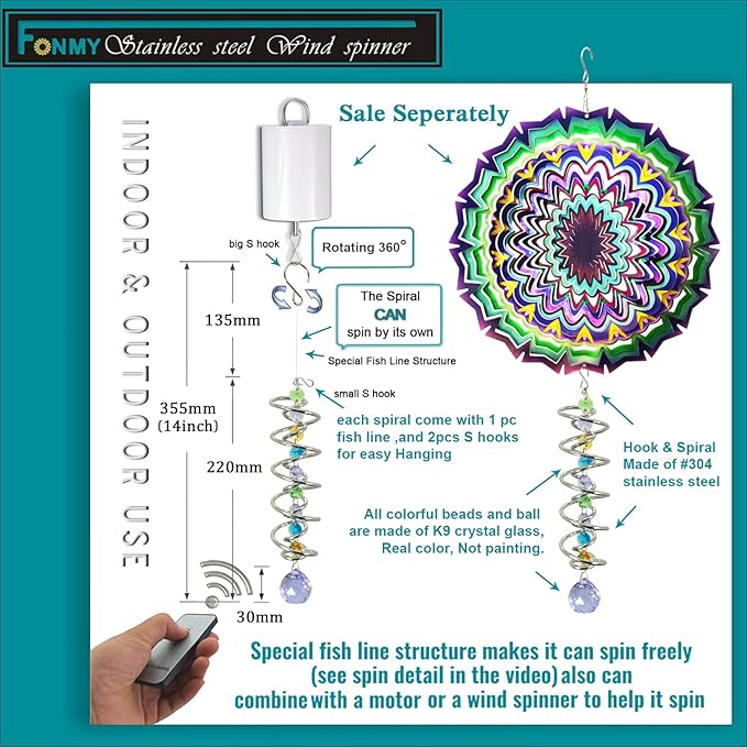 - 【PREMIUM CRYSTAL SUNCATCHER】The spiral with crystal is a special sun catcher rainbow maker, it’s Super Sparkly under sunshine. You can also add a motor(not include) to let the spiral to spin ,while spiral tail rotating (it can’t spin by itself.), the crystal ball seems to move up and down like floating and dancing in air, presents the magical visual illusion.