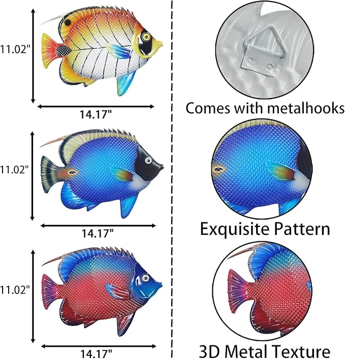 - Product Details - You will get 3 piece fish decoration - Measures 14 x 10 inches. The vivid metal wall decor matches is perfect for any decor style and can be displayed in bedroom, living room, office, study, baby room, kitchen, yard, porch, patio, garden and more