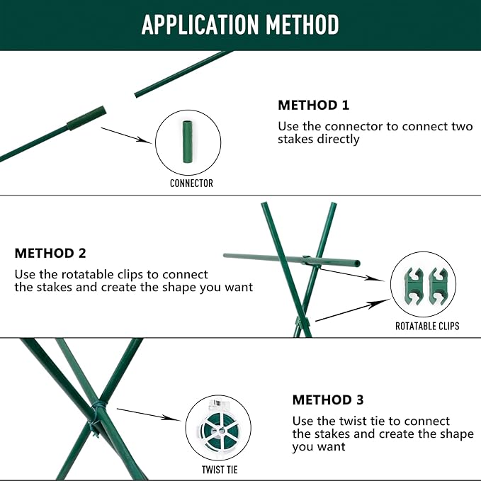 - 【Easy to Assemble】 Connect a desired number of stakes using connectors according to your specific needs. Use the rotatable clips or the twist tie to build an "X" or any other shape you want.