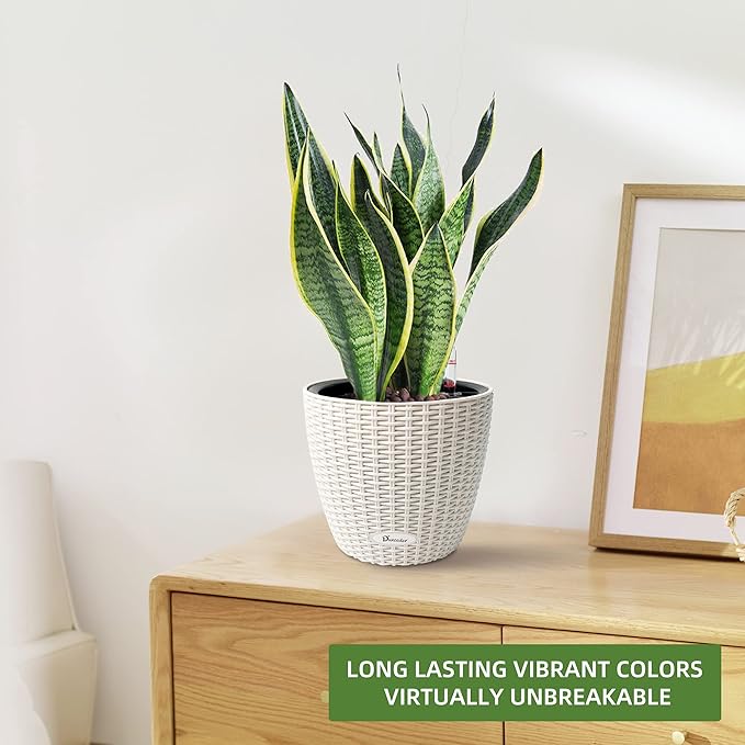 Dexceder 11x10 Inches Rattan Self Watering Planter Indoor Outdoor, Inner Pot Design, Thickened Table Flower Plant Pot with Water Level Indicator (Ivory White)
