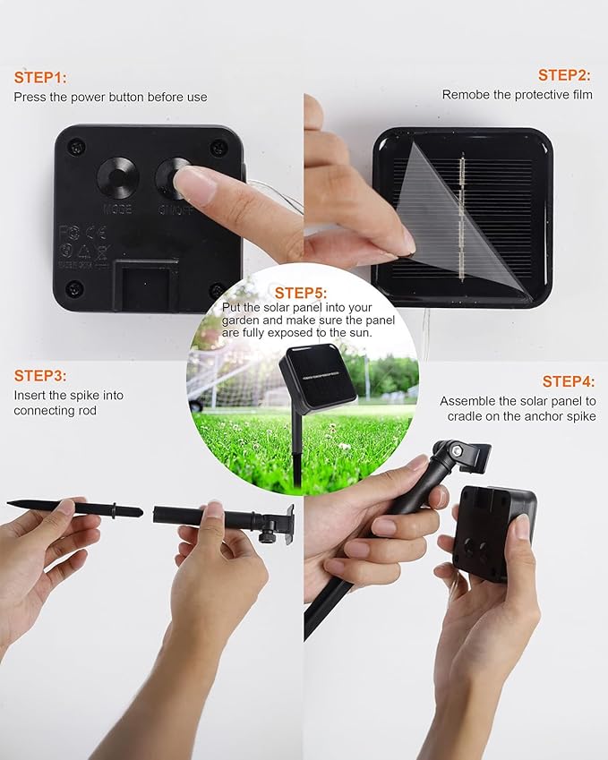 - Solar Powered Lights: Solar powered, charging in full and direct sunlight for 8-12 hours and operating for 10-14 hours (charging and operating time will vary depending on weather conditions), the lights automatically switch on at dusk and off at dawn. Each light includes a NI-MH AA 800mAh rechargeable battery, the battery has sufficient capacity to provide light all night. NOTE: There is an on/off switch on the back of the solar panel, please turn it on before charging