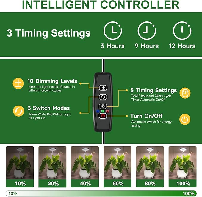 - 3 Lighting Modes and 10 Brightness: The full spectrum plant grow light offers 10 levels by pressing the button. 3 lighting spectrum โwhite light, warm white and red, Mix Lightingโ. you have more options to meet different illumination requirements.