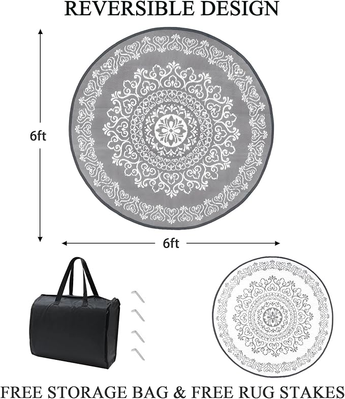 Pauwer Waterproof Outdoor Rug 6ft, Reversible Plastic Straw Patio Camping Rug, Indoor Outdoor RV Mat Carpet for Deck, Camper, Porch, Balcony, Backyard, Picnic, Floral Grey