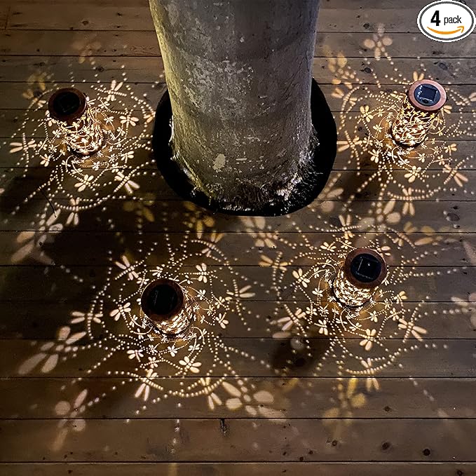 - Gorgeous & imaginative Garden Decor - Fusion the retro gold, copper of exteriors and irregular pattern inside, at darkness, the solar lantern casting a bright, warm light with dragonfly pattern, which looks like a dragonfly flying symbolizes change.