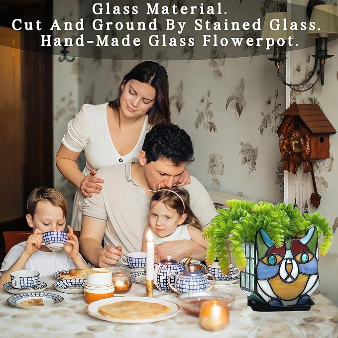 - HOME DECOR:This planter is also perfect for those who enjoy gardening but have limited outdoor space;Bring the beauty of nature indoors with the Stained Glass Cat Planter and add a touch of whimsy to your home decor