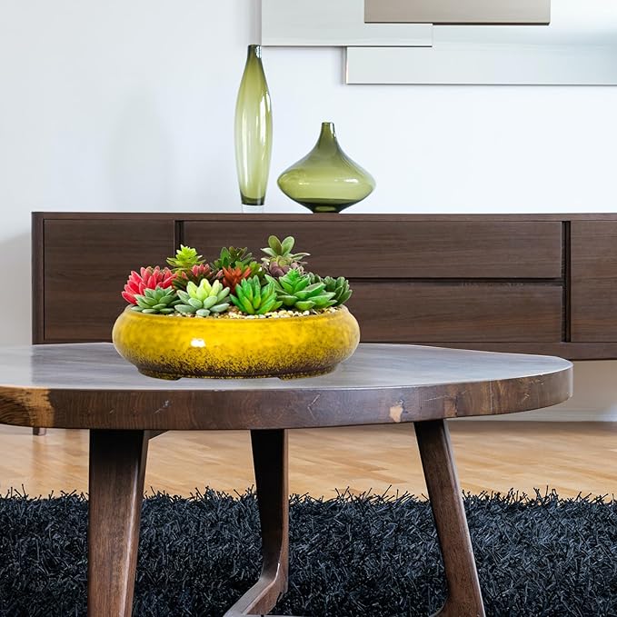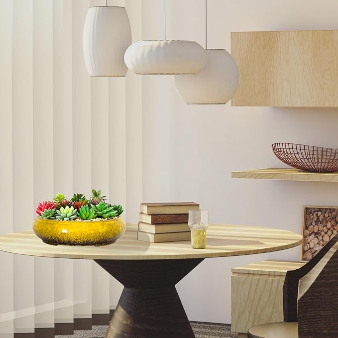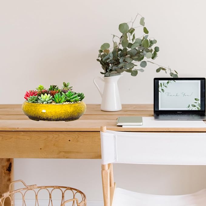 Succulent Pots - 11.5 Inch Ceramic Bonsai Pots with Drainage, Large Shallow Succulent Planters for Indoor Outdoor Plants, Round Glazed Cactus Flower Plant Container Bowl Home Desk Decor(Yellow)