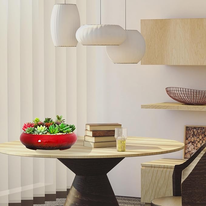 ARTKETTY Succulent Pots - 11.5 Inch Ceramic Bonsai Pots with Drainage, Large Shallow Succulent Planters for Indoor Outdoor Plants, Round Glazed Cactus Flower Plant Container Bowl Home Desk Decor(Red)