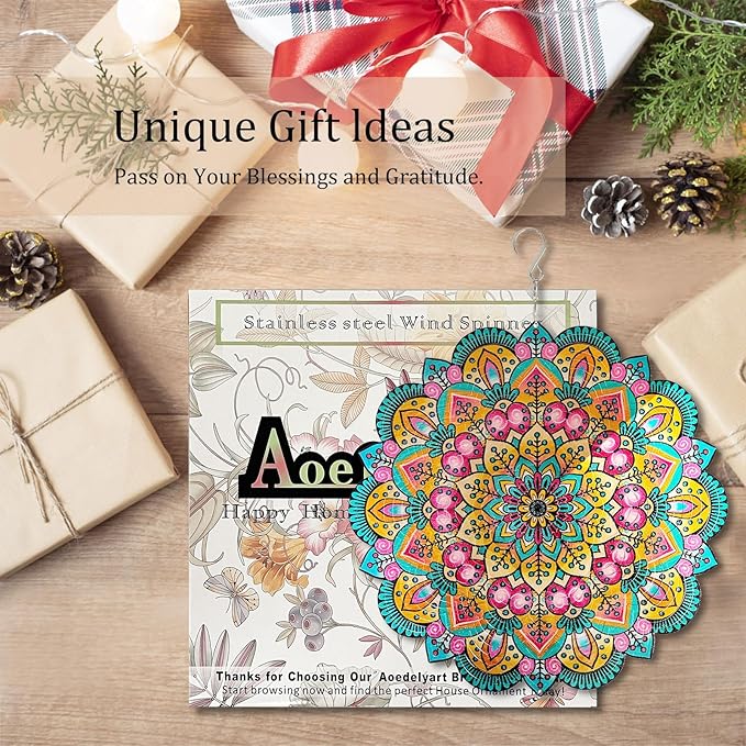 - ★【Laser Cut Metal Kinetic Art】Mandala Lucky star follows the trendy Kinetic art design style.The wind wheel can rotate 360°,creating a magical 3D stereoscopic visual effect by through the different colors and shiny dots on the surface,reflective gilt powder material gives off a sparkling,like the stars in the dark night,it illuminates the starry sky,pass on Lucky,exuding charming and magical vision and charming scenery whatever in night or day,wherever bed room or garden.