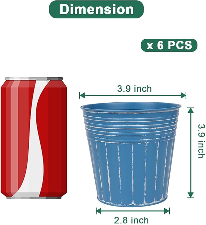- 【Size of Metal Pots】There are 6pcs metal planters in a package, Topper opening diameter 3.9 inch, bottom diameter 2.8 inch, barrel high 3.9 inch.
