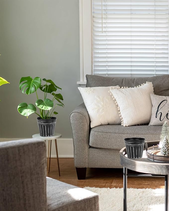 vensovo 5 Inches Black Metal Rustic Flower Pots - 6 Pcs Small Galvanized Planters with Drainage Hole and Rubber Plug, Rustproof Tin Bucket Plant Pot Farmhouse Vintage Style for Decor