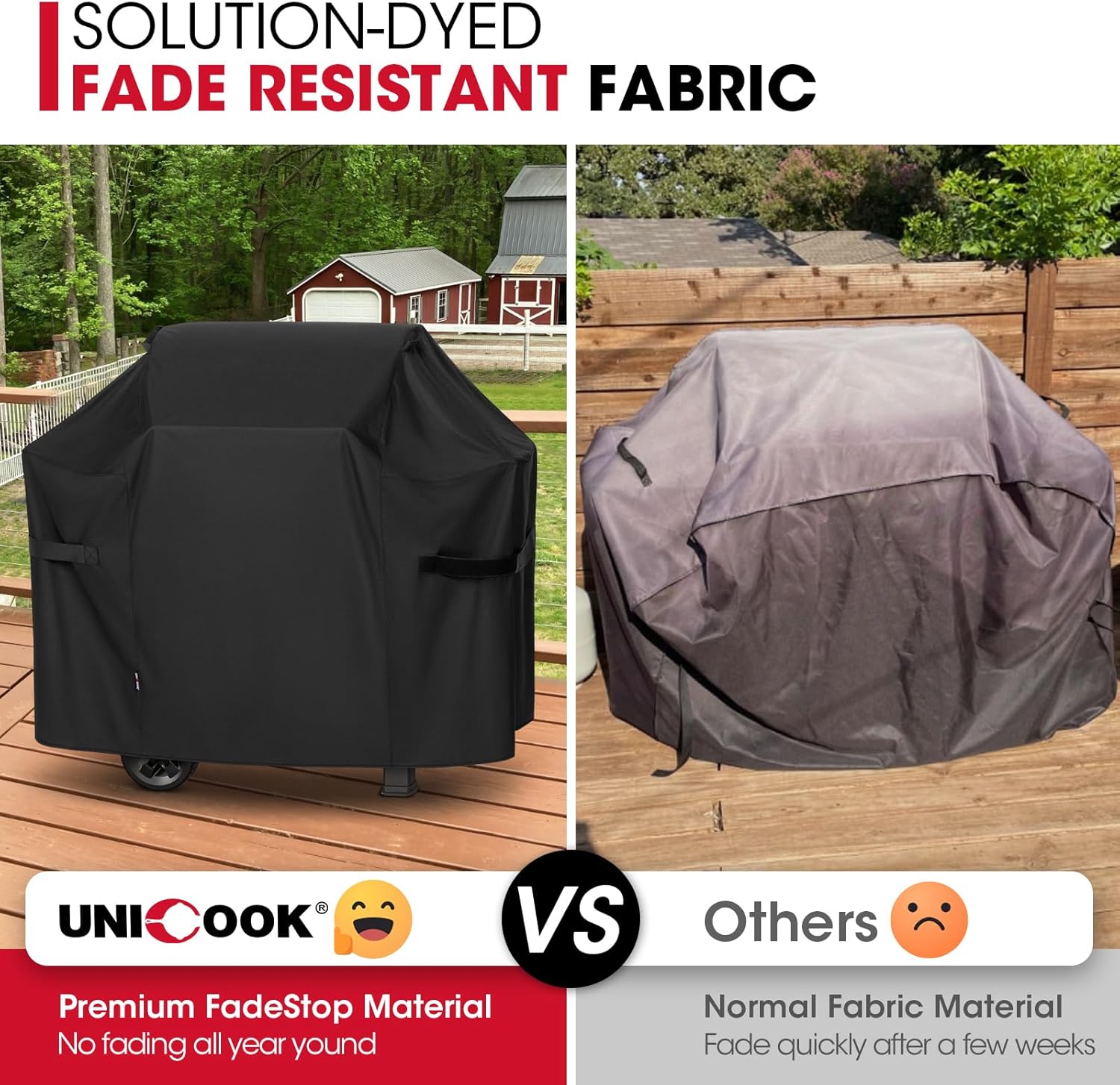 - Fade Resistant and Durable: Crafted with solution-dyed fabric, this Unicook grill cover resists fading, tearing and cold cracking, and shields your grill from UV rays, dust, and debris throughout the year. No more sun faded covers