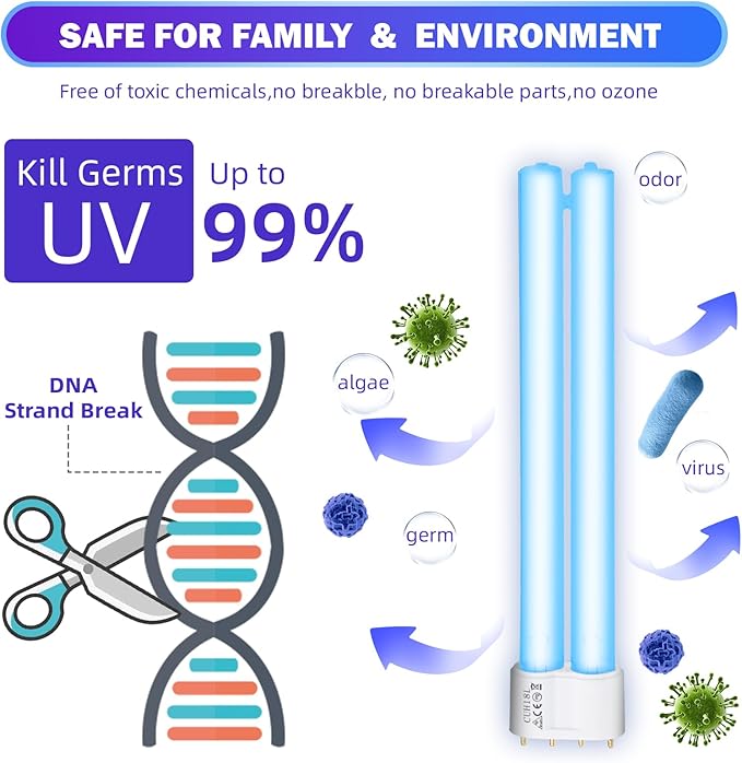 - 【Powerful 18W UV】With a wattage of 18 and a length of 8.75" 4-pin base, provides easy installation and compatibility with various devices. EPA Est. No. 96998-CHN-1.