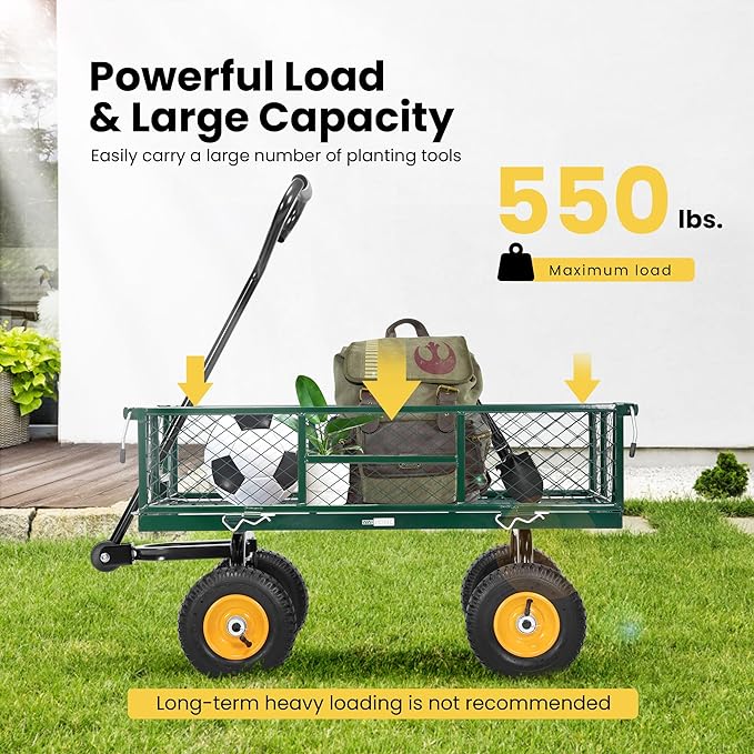 - POWERFUL LOAD AND LARGE CAPACITY - VIVOHOME's multi-functional garden cart has meticulous workmanship and strong design sense; This garden cart has a steel mesh bed that is 34’’ in long and 18’’ in wide, carrying large amounts of planting tools with ease; Its maximum load can reach 550 lbs.; From chopped wood to fertilizer, you can carry them with this practical and convenient cart with ease (to prolong its life, long-term heavy loading is not recommended)