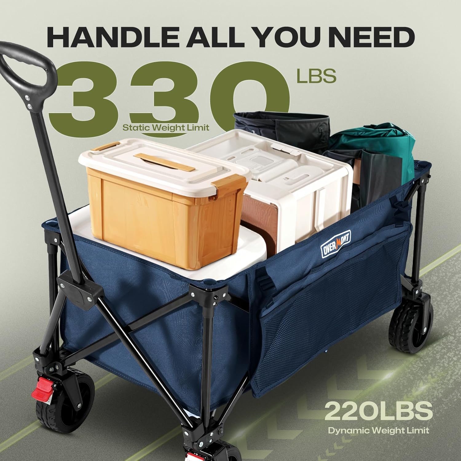 - [Built to Last]: Crafted from rugged Q195 carbon steel and durable Oxford fabric, Overmont foldable wagon handles the toughest tasks. Front wheels with brake and swivel functions ensure smooth control on any terrain. Experience superior quality and durability with every use.