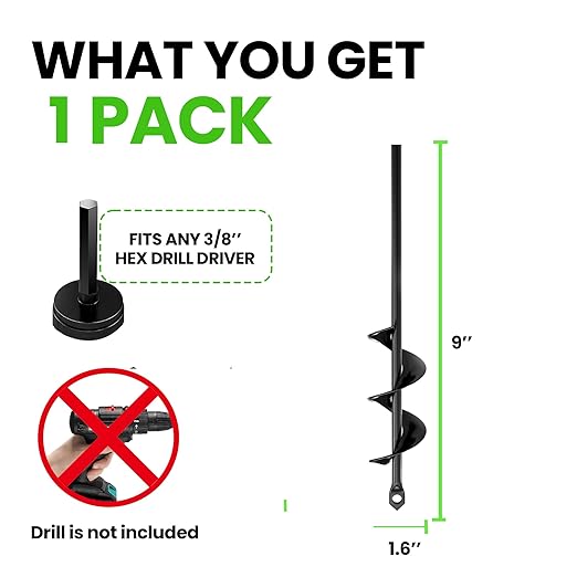 - Includes 1.6 Inch x 9 Inch Auger Drill Bit (Drill Not Included): Experience effortless digging with this easy-to-use auger bit! Simply attach it to a standard 3/8” hex bit drill, hold it with both hands, and watch as you create the perfect posthole by digging down and reversing the drill to bring the soil back up