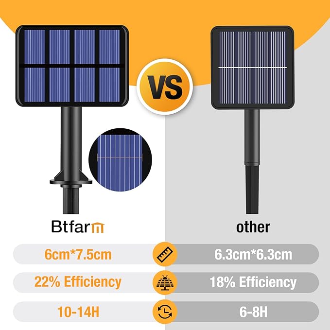 - 【High Efficiency & Auto On/Off】The larger size of the new solar panel translates to a greater surface area for capturing sunlight, resulting in increased charging efficiency. That is to say the device can charge faster and potentially extend its usage time. Automatic full charge in direct sunlight for 6-8 hours and then automatically works for 10-14 hours (Note: charging and working time depend on the weather). Please press the ON/OFF button before charging.