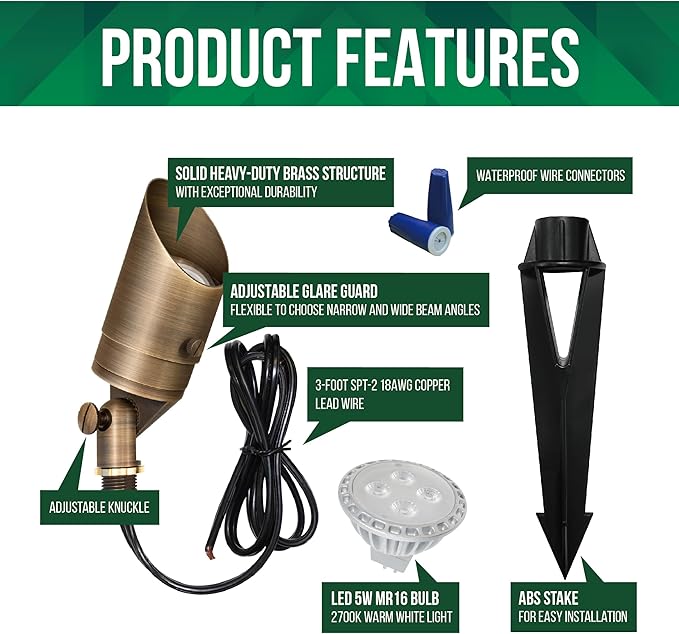 - Easy Installation๏ผEquipped with ABS ground spike, wire connectors (1 #14 w/1-3 #18 or 20, 2 #14 w/1 #18), MR16 bulb and 39.9โโ pre-wired leads, these lights can be easily installed. Compatible with most 12V landscape lighting systems. Must be powered by a 12V low voltage transformer (not included).