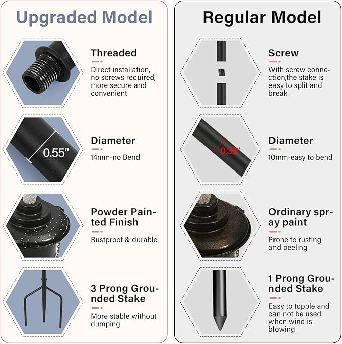 - ✿3 Prong Grounded Stake: Metal Torch has 3-prong grounded stake,means the firmness and stability are much better than 1 prong, ensuring the metal torch lasts for several seasons.