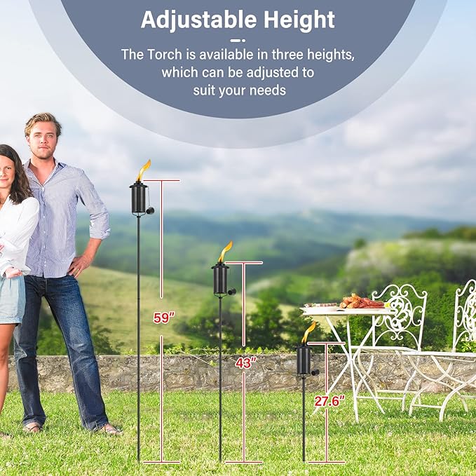 - 🏡Outdoor Décor:This torch features a distinctive black finished metal design,can DIY Height, a long-lasting fiberglass wick & metal snuffer to safely extinguish the flame at any time.Suitable for a variety of theme parties, making the outdoor environment romantic and cozy.