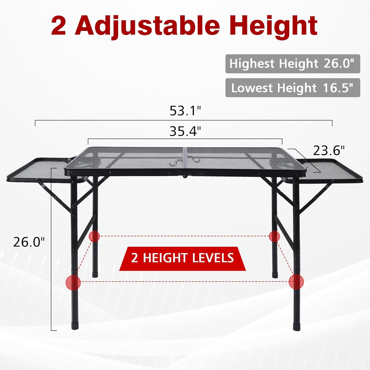 Folding Grill Table, 3x2 FT Portable Camping Table with 2 Wing Panels, Height Adjustable Metal Tables with Mesh Desktop and Mesh Bag, Outdoor Furniture for Camping, Picnic, Beach and BBQ, Black