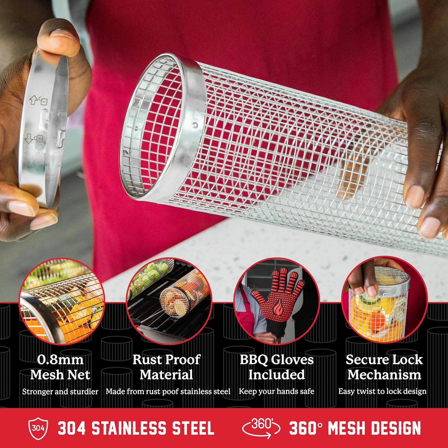 - 【ENGINEERED FOR DURABILITY & PERFORMANCE】Crafted from premium 304 stainless steel, our round grill nets are built to last, making them the strongest and most reliable grilling companions on the market. Don't settle for flimsy grilling baskets that bend & wear out after a few uses. The 0.8mm thick cylinder mesh ensures that your delicious food stays intact while allowing those mouthwatering grill marks to sear through to perfection.