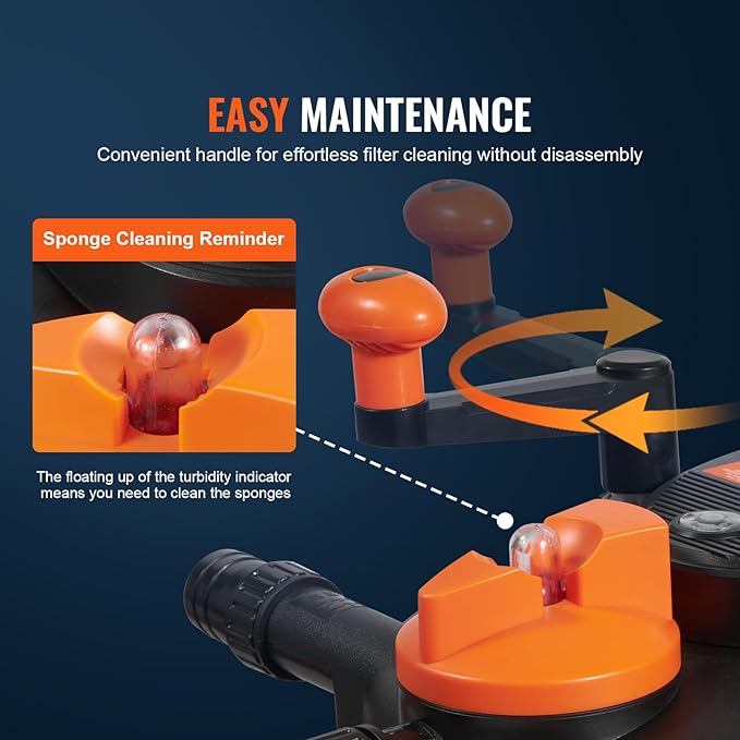 - Cleaning Made Simple: Our pond pressure bio filter sports a crank handle on top, making it easy to clean the filter with the internal cleaning rod. When the top turbidity indicator floats up, it's time to freshen up your filter sponge โ no fuss, no opening the container. Plus, both sponge and bulb are replaceable for your convenience.