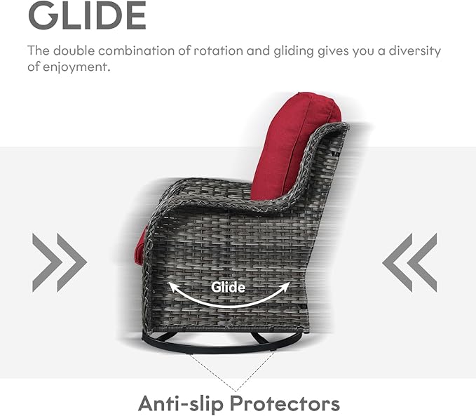 - 3.Multifunctional Patio Wicker Chair: The base of the swivel rocking chair is a dual-function disc base that can rotate 360 degrees and also glide back and forth, the operation will be very smooth. The swivel rocking chair is designed to help you sit more easily and comfortably, the base with a non-slip pad, so that the swivel rocker chair is more stable contact with the ground, do not worry at all that the chair will slide at will.