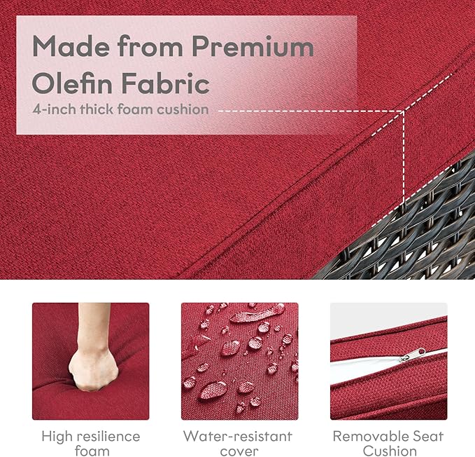 - 4.Comfortable And Easy To Clean: Both chairs in this outdoor patio set are equipped with 4-inch thick foam seat cushion and 8-inch thick cotton back cushion, which is ergonomic and improves the overall comfort of the wicker chair. The patio chair cushion covers are made of outdoor specialty olefin fabric that is water resistant, and each cushion is equipped with zippers that are removable and easy to clean.