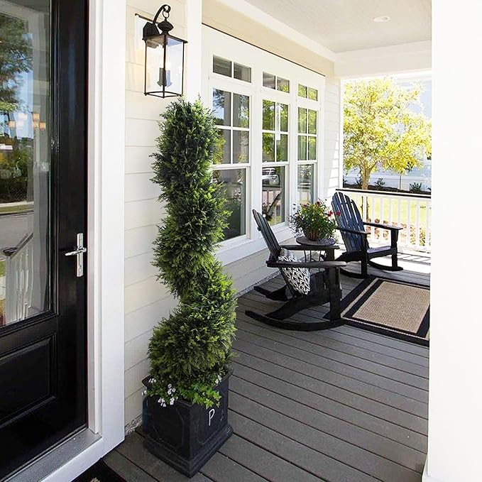 - EACH ALMOST 39 INCH TALL: Each of the cedar spiral topiary trees included in this set stands about 39 inch tall (1m). The greenery is adjustable, so you can use them as spiral trees for front porch decorating, decks, foyers, entryways, walkways, etc.