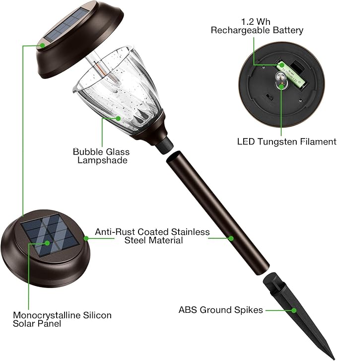 - Luxury Solar Lights with Crystal-Clear Durability - Featuring bubble-textured glass (93% light transmittance) and nano-coating for 96% easier cleaning, combined with 99.6% UV stability (5+ years) to resist yellowing. Superior Long-Term Light Transmittance Glass retains 80%+ clarity for 2 years (vs plasticโs 5%), while scratch-resistant design elevates modern decor and FDA-compliant storage solutions. Energy-efficient 100% light diffusion reduces waste, perfect for sustainable home landscapes.