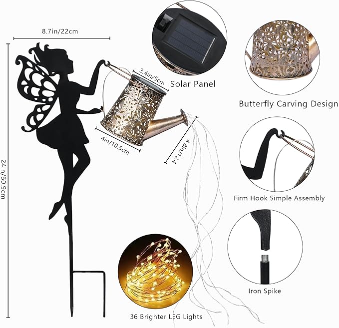 - Metal Outdoor Pathway Light - Enchanting Fairy Design: Illuminate your outdoor spaces with our whimsical solar-powered metal fairy pathway light, standing at an impressive 24 inches tall. Handcrafted with exquisite attention to detail, it portrays a fairy holding a watering can light, adding a touch of magic to your surroundings.