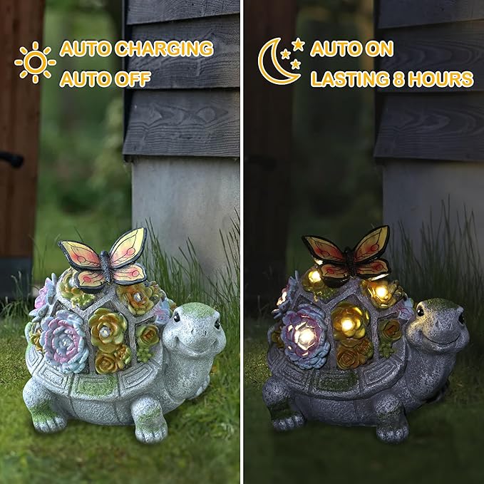 - 【 Easy to Use】Renewable and clean energy - Convert solar energy into electricity during the day. Switch the outdoor turtle decor to "ON", and the turtle figurine light will auto-charge during the day, auto light up at night