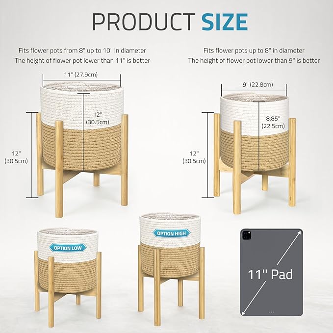 PAULINN Plant Basket with Stand 2 Packs, 11" x 11" & 9" x 9" Woven Plant Basket with Bamboo Stand, for Indoor Plants, Fits 10" x 10" & 8" x 8" Plant Pots