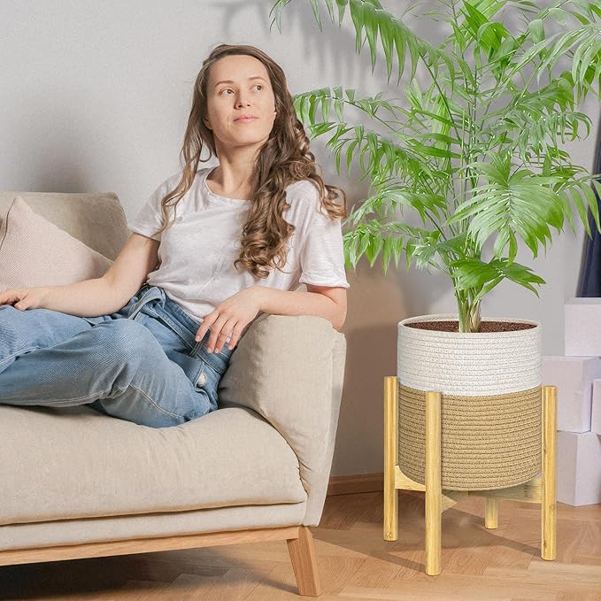 - 【Plant Basket with Stand】Natural jute woven rope with coiling sewn method to create a plant basket that is stiff enough to hold its shape.100% bamboo stand adds a natural focal point and guarantees it is clean and recyclable.